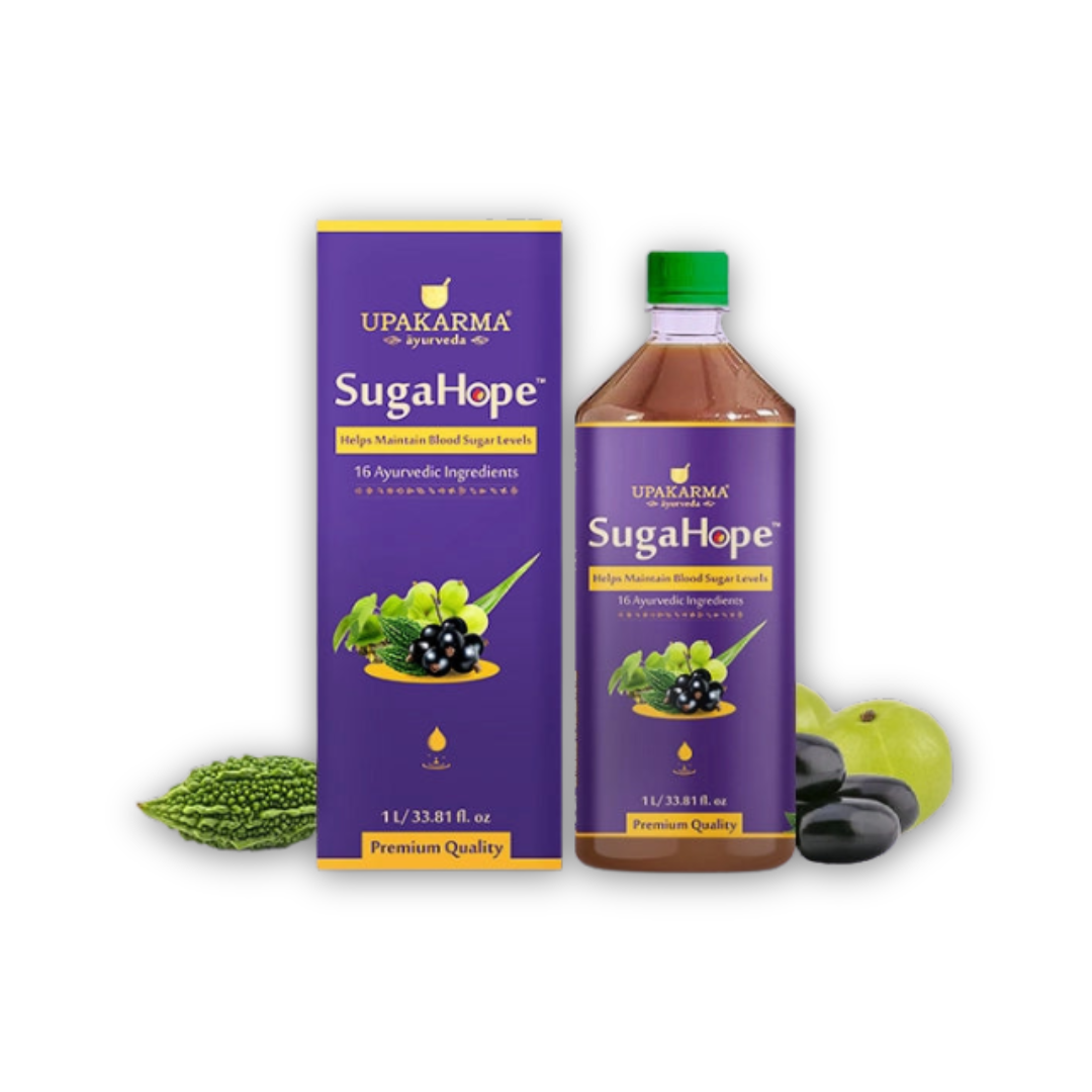 Upakarma Ayurveda SugaHope Juice er blanda af 16 ayurvedískum jurtum eins og Karela, Jamun, Gudmar, Neem, Giloy og Amla, sem hefur verið vandlega samsett til að styðja heilbrigð blóðsykursgildi á náttúrulegan hátt.
